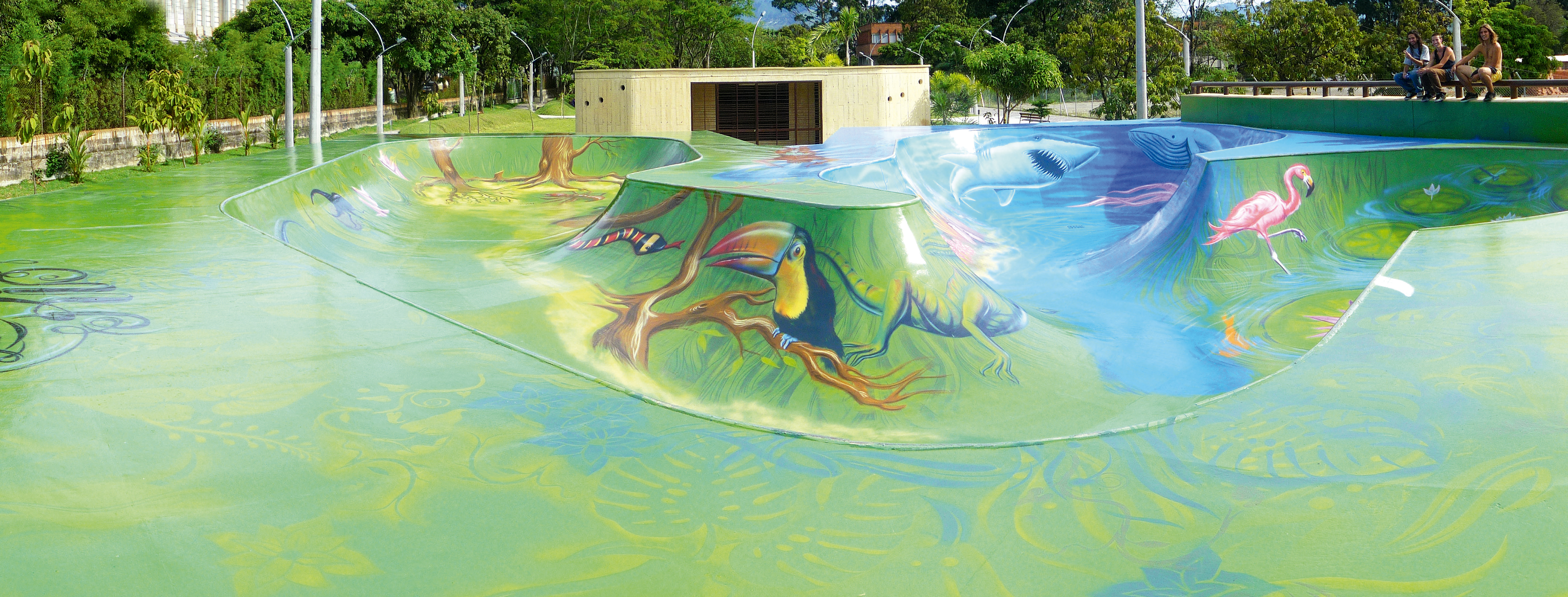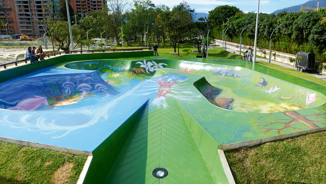 Los seguidores, conocidos como skaters, se popularizaron por todo el mundo y Medellín no fue la excepción. Debido a la falta de lugares donde practicar, los skaters se han venido apropiando de los espacios públicos y abiertos de la ciudad que cumplen con las condiciones del suelo, los desniveles y los elementos urbanos que necesitan para patinar, pero con el auge de este deporte en los últimos años, se han construido varias pistas y skate parks en diferentes puntos de la ciudad como la Terminal del Sur, el estadio, Castilla, El Salado y Ciudad Del Río. Como era de esperarse, la pintura se desgastó bajo el caucho de las ruedas de las bicicletas y el poliuretano de los skates, la pérdida de los vivos colores de la selva y el océano son testimonio de que este ha sido un espacio vital para decenas de jóvenes, adultos y niños que se reúnen a practicar con sus patinetas y bicicletas, en un ambiente moderno, urbano y lleno de vida.