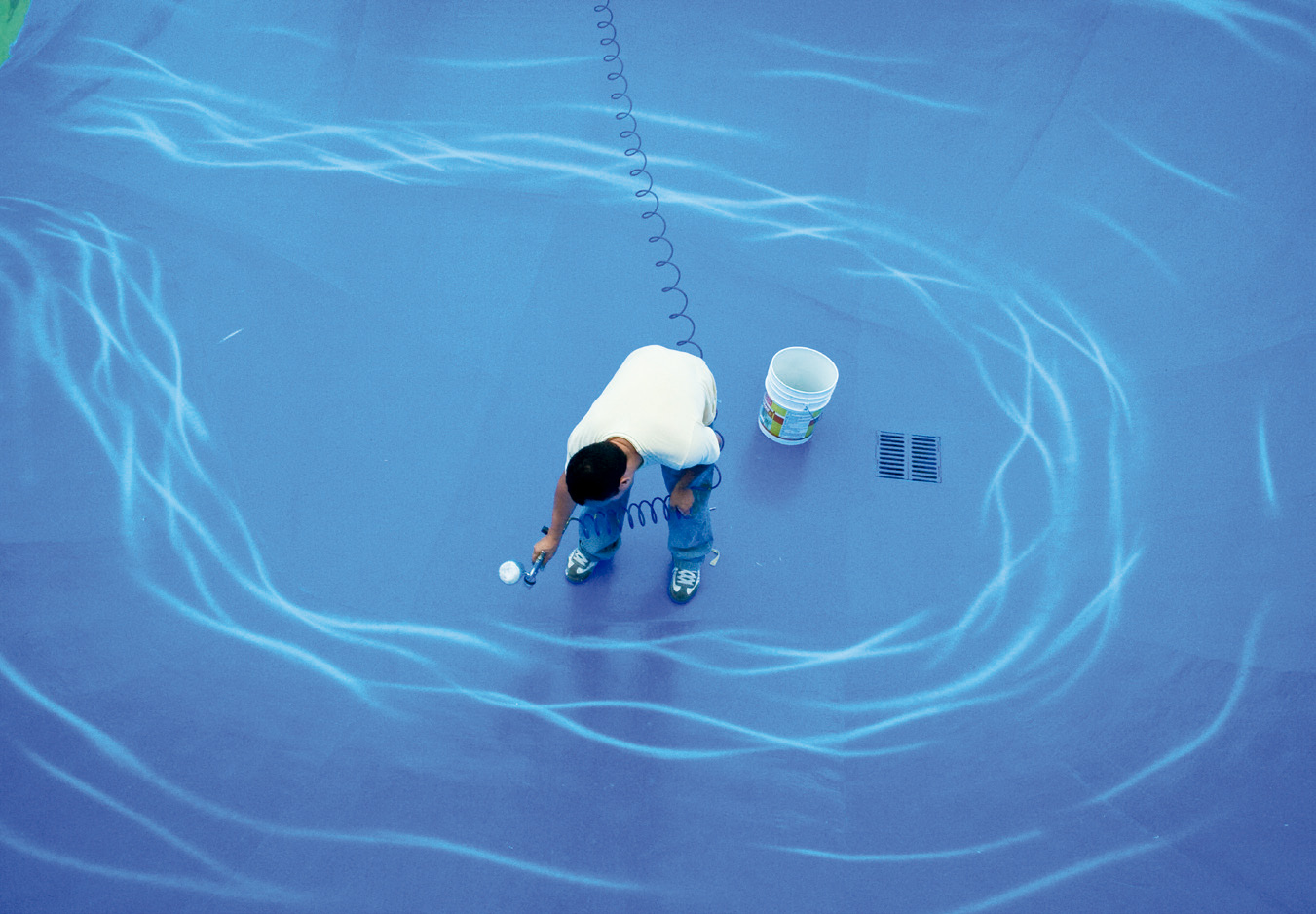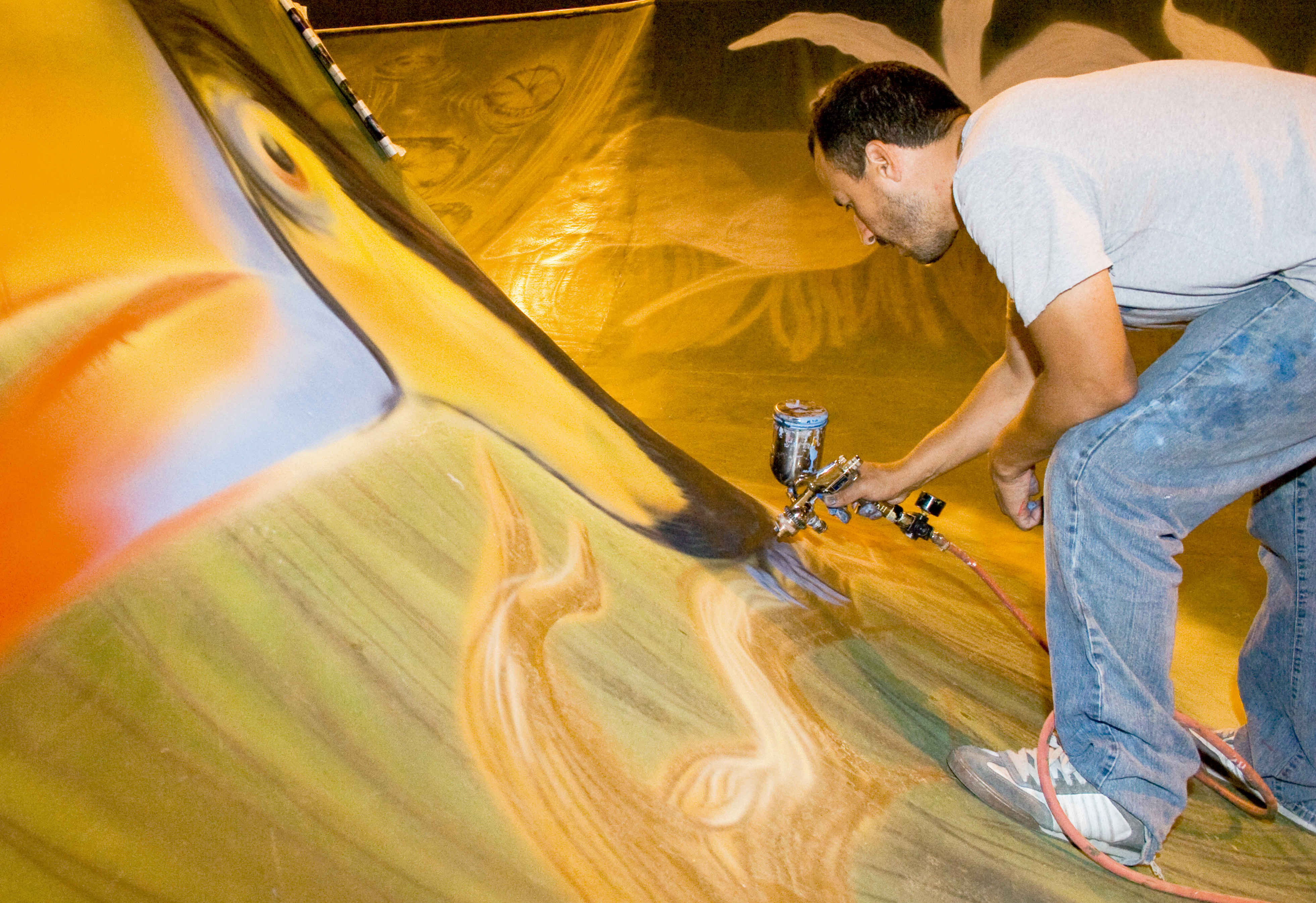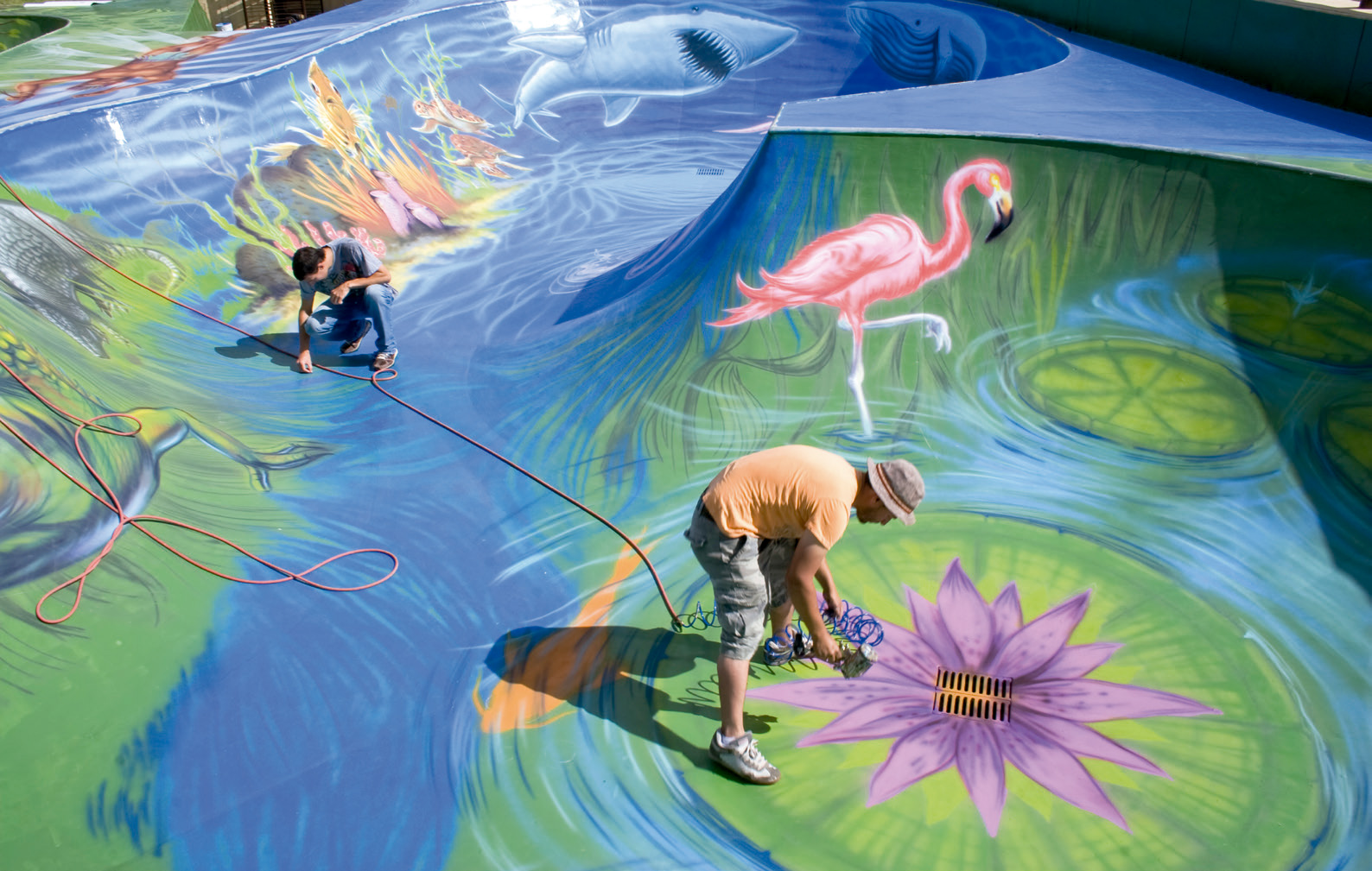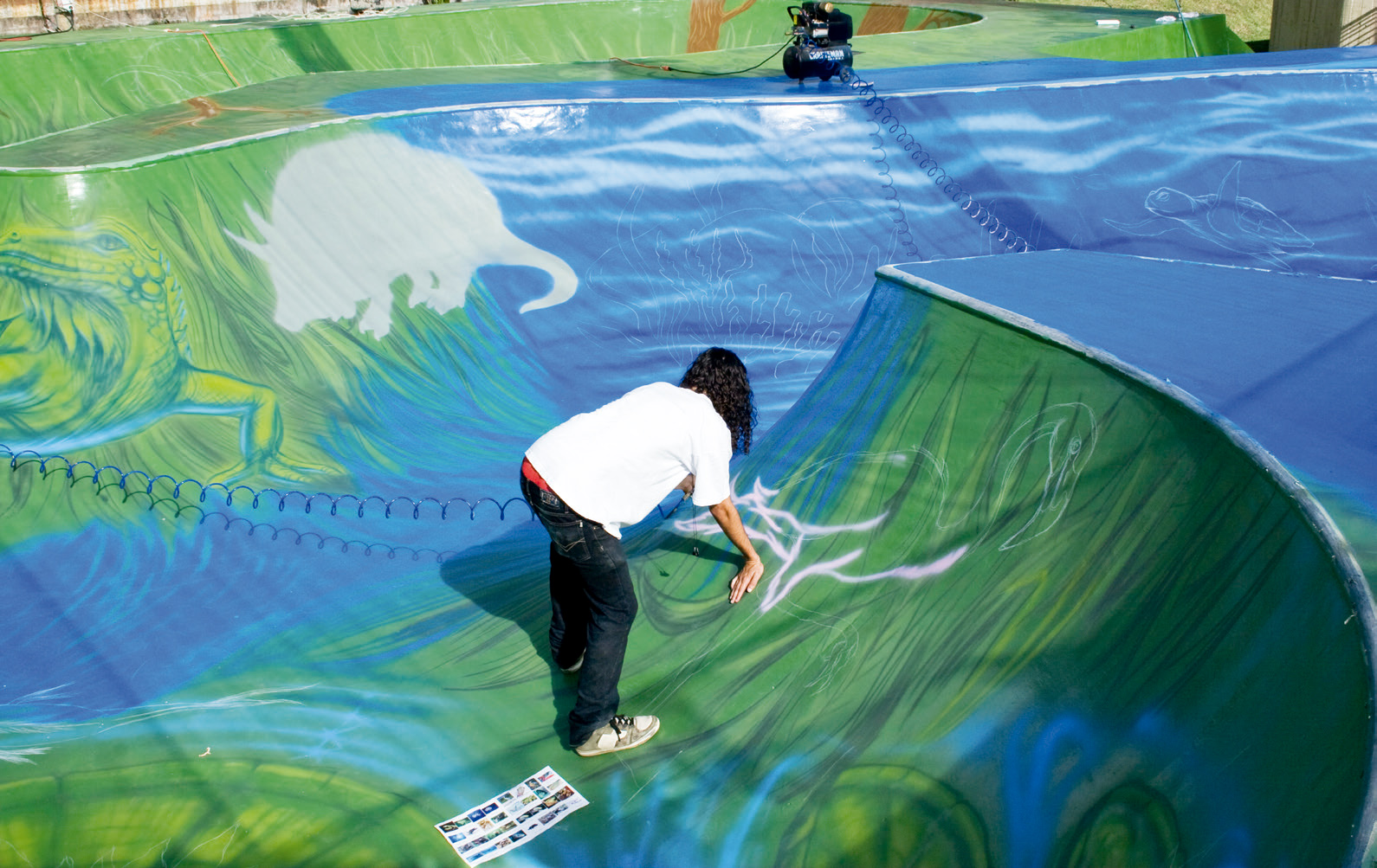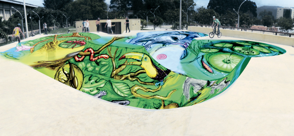 Una mañana, recién terminada la construcción, los promotores realizan una visita al bowl y descubren con sorpresa que los skaters habían pintado grafitis. Era inevitable que en un primer acercamiento el acto fuera leído como subversivo, pero en lugar de interpretarlo como una agresión al proceso constructivo, el gesto se vio como una gran oportunidad para iniciar un proceso de apropiación del espacio. Es así como Valores Simesa, desarrolladores del predio, iniciaron un acercamiento a los skaters, para que estos presentaran una propuesta gráfica que plasmara el espíritu de esta subcultura urbana y que al mismo tiempo generara aprecio y respeto por un espacio que al final de cuentas les terminaría perteneciendo a ellos. Fue así como con el patrocinio de Valores Simesa y con el entusiasmo que los caracteriza, el grupo que presentó la propuesta plasmó sobre el bowl su diseño cargado de color, naturaleza y fauna, representando una simbiosis del mundo marino y los animales terrestres, que dio vida a uno de los sitios con más concurrencia y vitalidad en todo el parque.